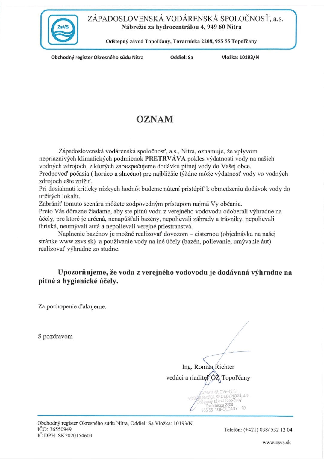 Voda z verejného vodovodu je dodávaná výhradne na PITNÉ A HYGIENICKÉ ÚČELY.