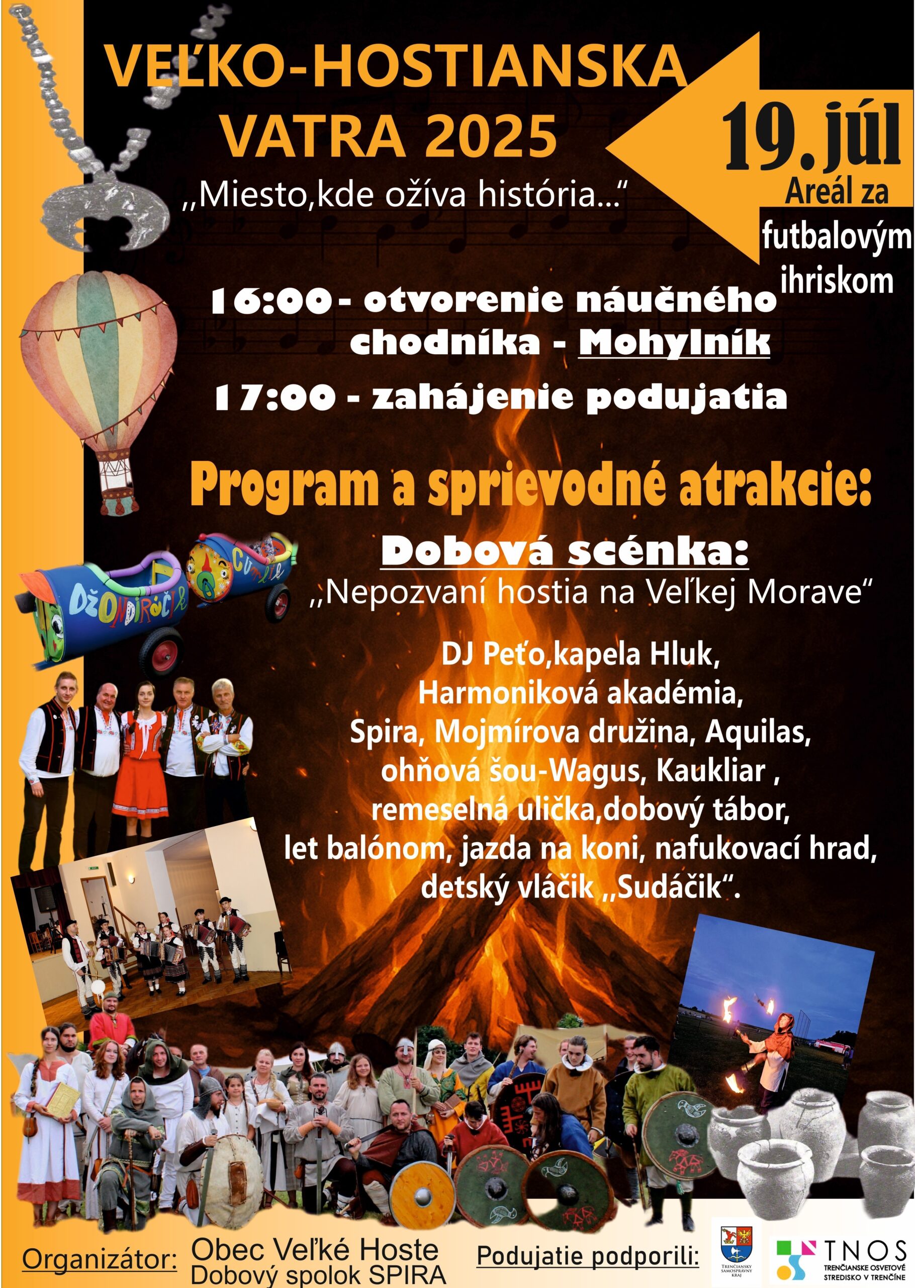 Vážení občania, Obecný úrad Veľké Hoste a dobový spolok SPIRA Vás srdečne pozývajú na tradičné podujatie Veľko-Hostianska Vatra, ktoré sa uskutoční v sobotu 19. júla za futbalovým ihriskom vo Veľkých Hostiach. Program začne o 16,00 hodine slávnostným otvorením náučného chodníka MOHYLNÍK. Nasledovať bude dobová scénka v podaní historických skupín, vystúpenie Harmonikovej akadémie a kapely HLUK. Sprievodný program budú tvoriť remeselné trhy, let balónom, jazda na koni, vláčik sudáčik, nafukovací hrad a samozrejme pestré občerstvenie pre malých i veľkých. Prineste si so sebou dobrú náladu a chuť zabávať sa. Tešíme sa na vás.